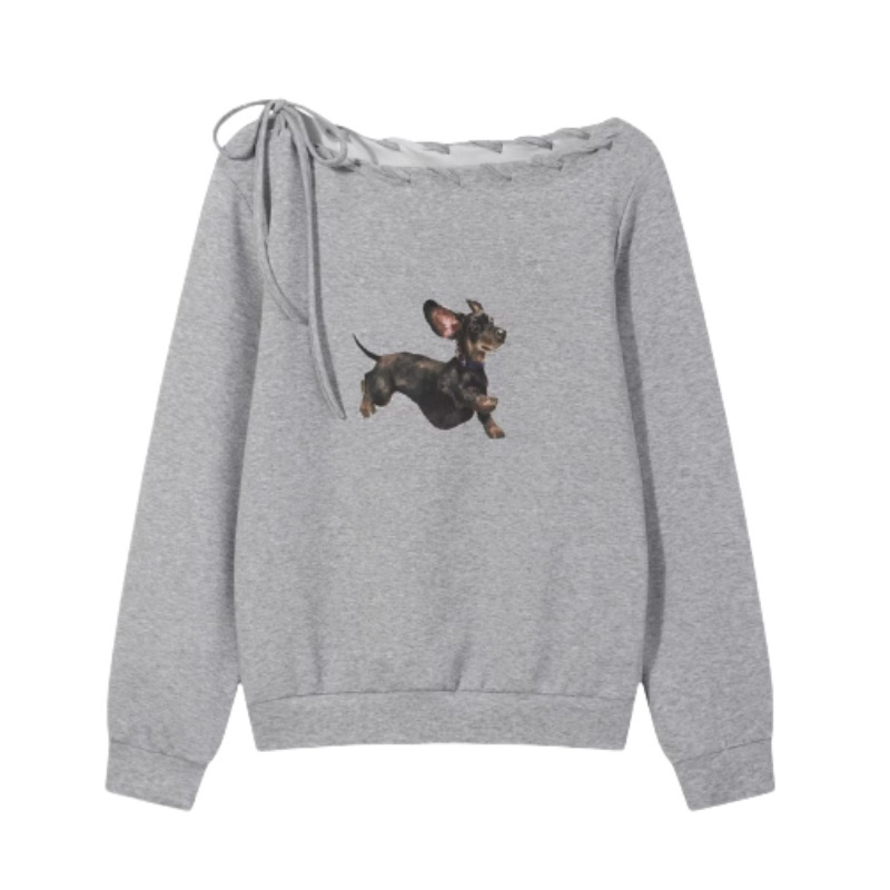 Grey Off-Shoulder Lace-Up Print Sweatshirt